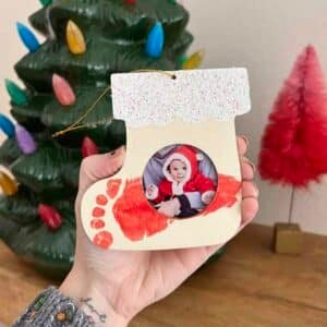 Simply purchase a stocking ornament (with or without a picture frame) and choose a washable paint color. Ensure your child’s foot is clean and dry, and then apply the paint liberally to the sole of their foot. Press their foot gently at the foot of the stocking and let it dry.